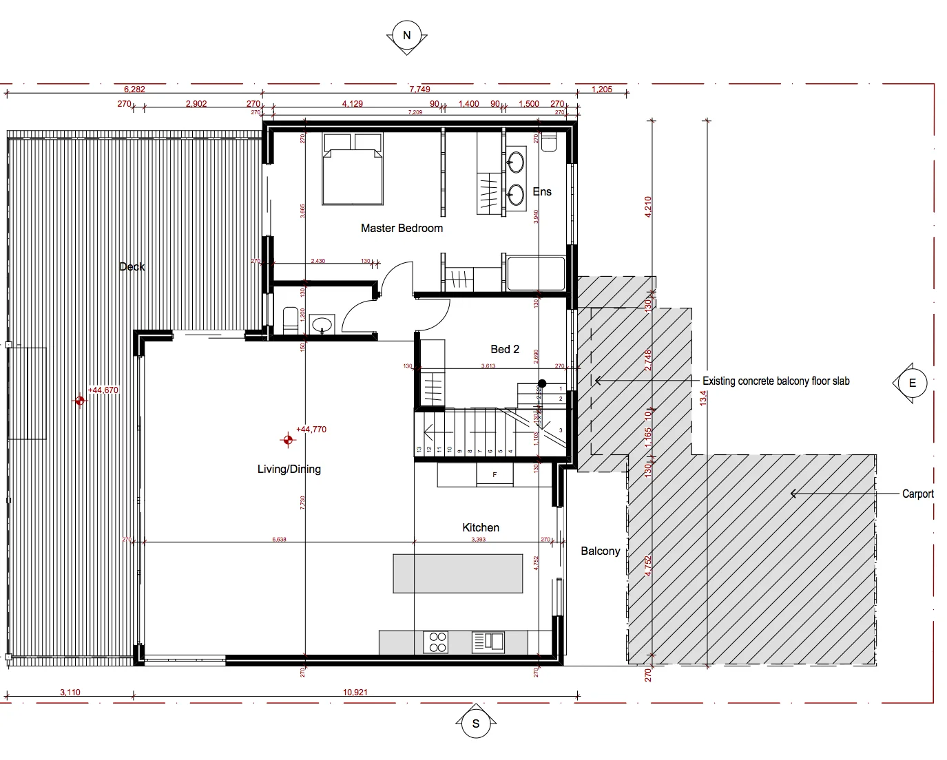 Whilst the open plan living space on the upper level was an adequate space, the original ceiling height felt so low it dominated the space to the point of being uncomfortable. The old tiled roof was replaced with a lighter metal roof and structural changes enabled a 'cathedral' ceiling to be created transforming the main living area. However, the low ceiling height could not be changed in all areas due to engineering and budget constraints, and so to create a sense of higher ceilings, all internal doors were extended the full height to the ceiling; ceiling fans were inset to add height and interest, not just for practical reasons.
