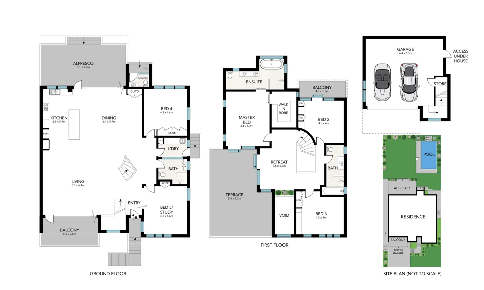 Squareset door and window openings and Spotted Gum skirtings ensure a modern sophisticated finish whilst each room and space has an individually crafted shadowline ceiling of varying heights, to create interest and drama throughout. Various floor finishes including stone, tiles and timber are seamless and level throughout. Louvered windows, full ceiling height windows and skylights, ensure the huge internal spaces are full of natural light and airflow, and wide eaves protect from the harsh midday sun.